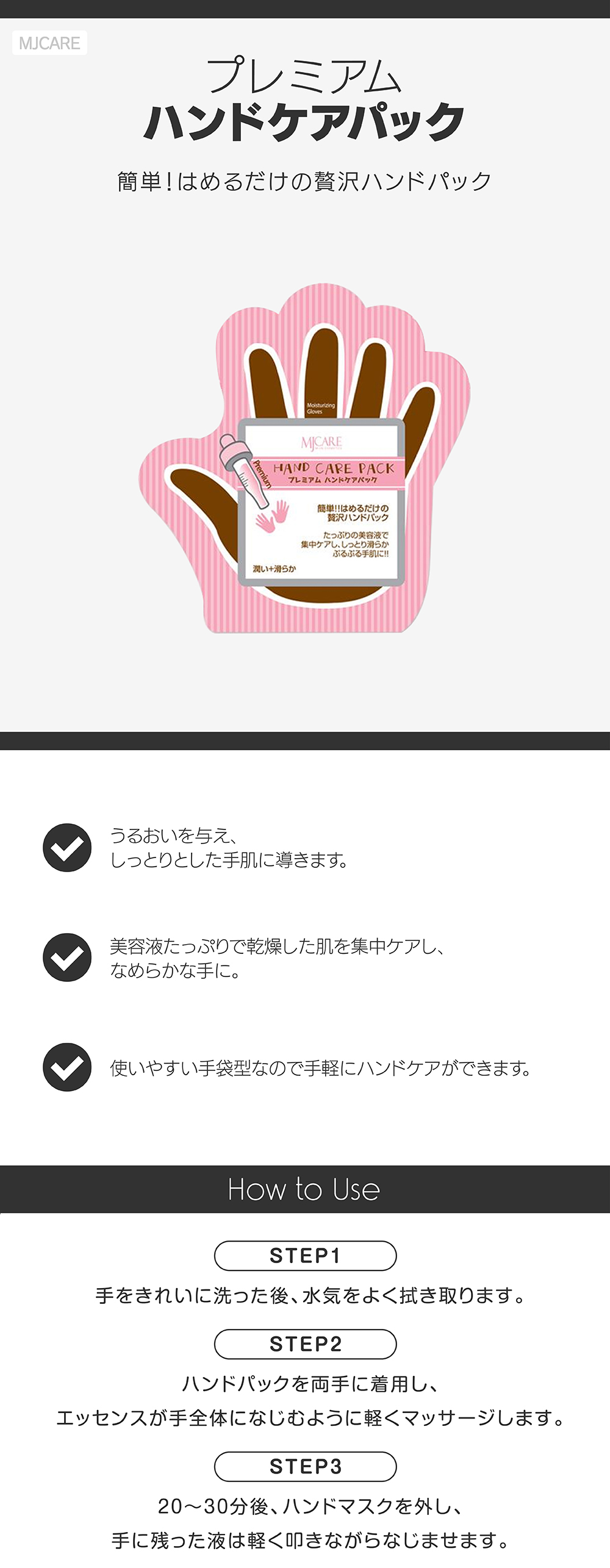 簡単!はめるだけの贅沢ハンドパックうるおいを与え、しっとりとした手肌に導き、美容液たっぷりで乾燥した肌を集中ケアし、なめらかな手に。使いやすい手袋型なので手軽にハンドケアができます。
