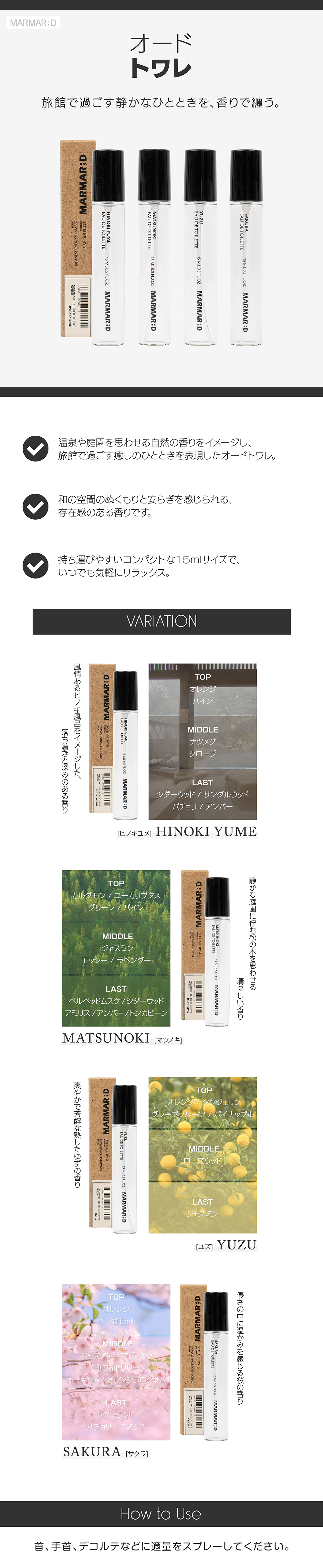 旅館で過ごす静かなひとときを、香りで纏う。温泉や庭園を思わせる自然の香りをイメージし、旅館で過ごす癒しのひとときを表現したオードトワレ。和の空間のぬくもりと安らぎを感じられる、存在感のある香りです。 持ち運びやすいコンパクトな15mlサイズで、いつでも気軽にリラックス。【ヒノキユメ】風情あるヒノキ風呂をイメージした、落ち着きと深みのある香り。【マツノキ】静かな庭園に佇む松の木を思わせる清々しい香り。【ユズ】爽やかで芳醇な熟したゆずの香り。【サクラ】儚さの中に温かみを感じる桜の香り。