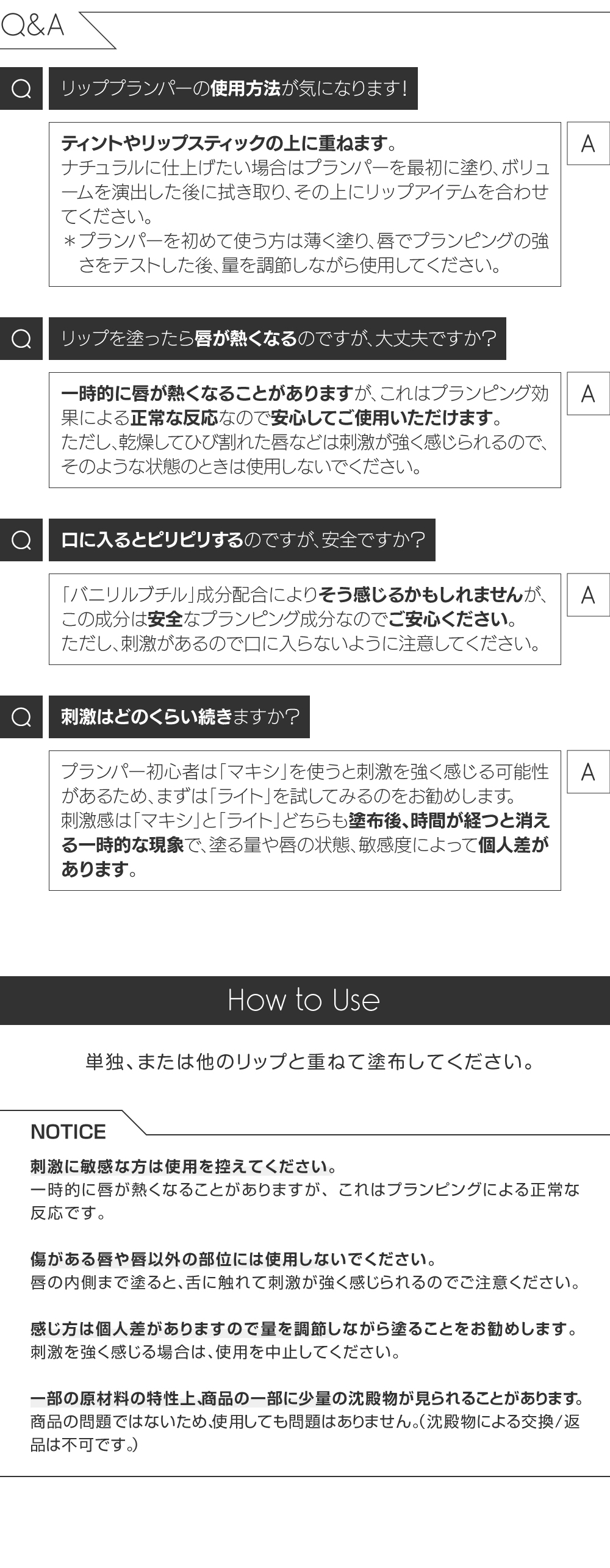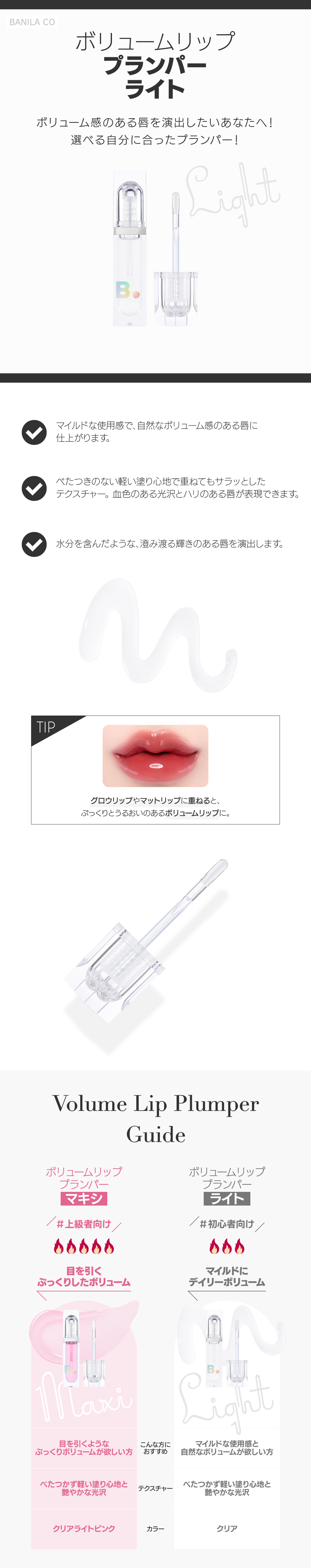 ボリューム感のある唇を演出したいあなたへ! 選べる自分に合ったプランパー! マイルドな使用感で、自然なボリューム感のある唇に仕上がります。べたつきのない軽い塗り心地で重ねてもサラッとしたテクスチャー。血色のある光沢とハリのある唇が表現できます。水分を含んだような、澄み渡る輝きのある唇を演出します。
