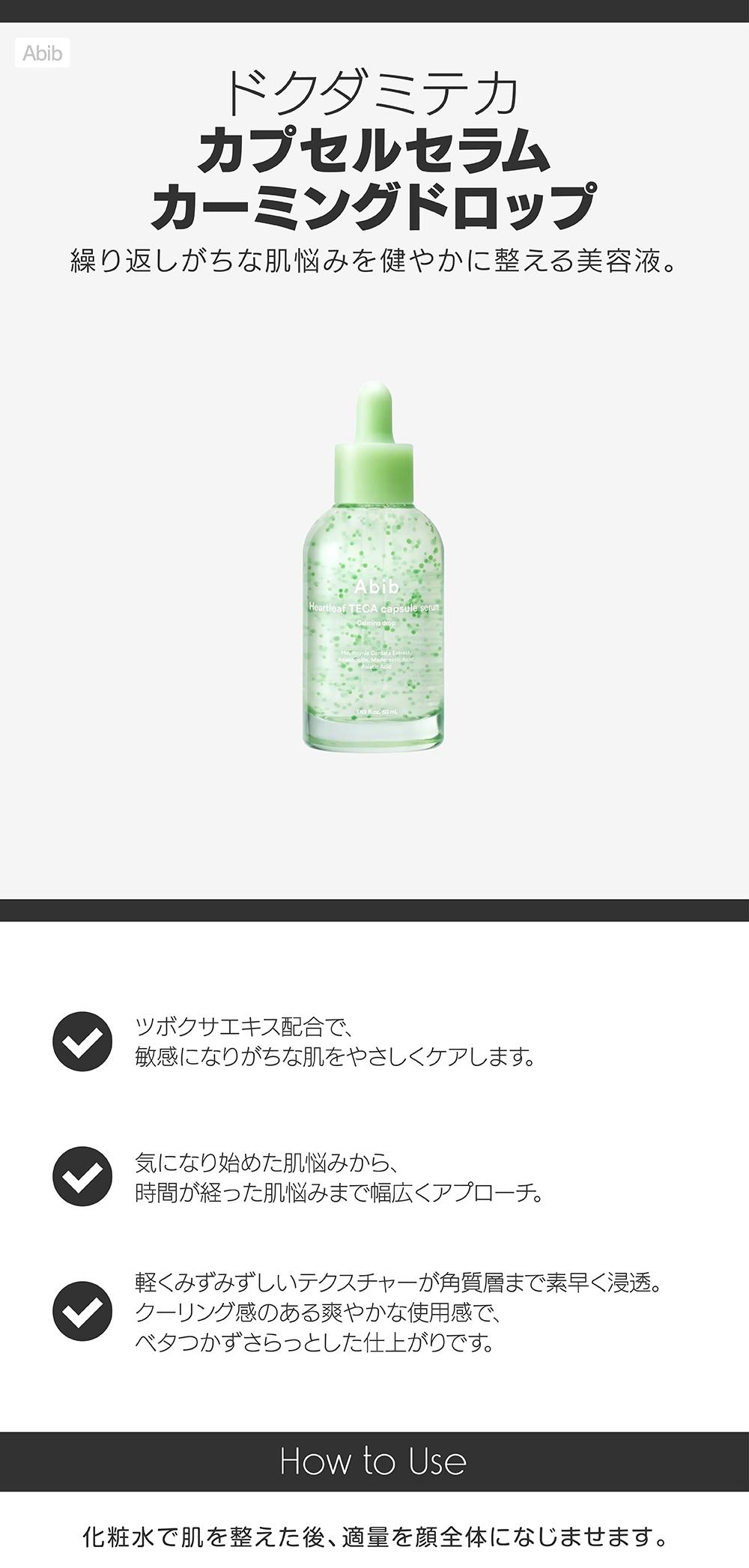 繰り返しがちな肌悩みを健やかに整える美容液。ツボクサエキス配合で、敏感になりがちな肌をやさしくケアします。気になり始めた肌悩みから、時間が経った肌悩みまで幅広くアプローチ。軽くみずみずしいテクスチャーが角質層まで素早く浸透。クーリング感のある爽やかな使用感で、ベタつかずさらっとした仕上がりです。