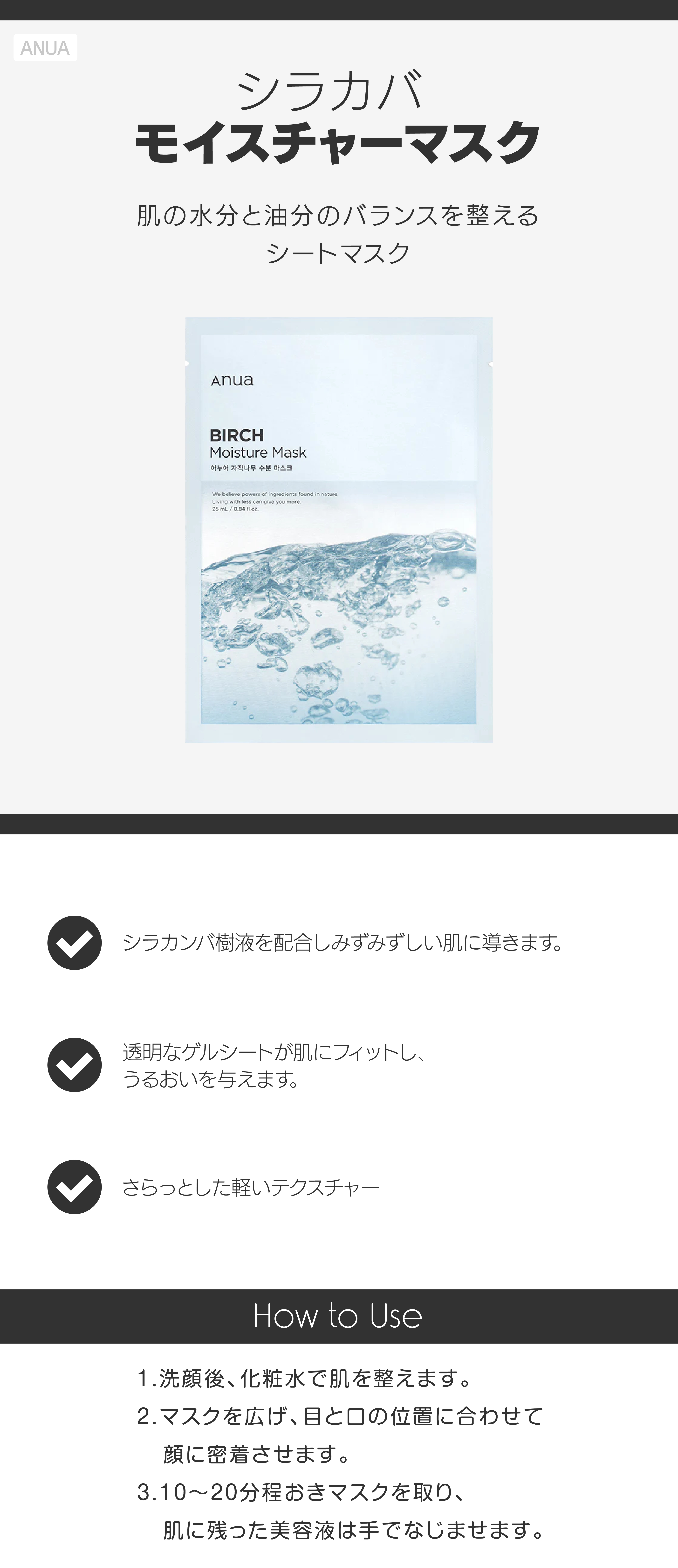 肌の水分と油分のバランスを整えるシートマスク。 シラカンバ樹液を配合しみずみずしい肌に導きます。 透明なゲルシートが肌にフィットし、うるおいを与えます。 さらっとした軽いテクスチャー