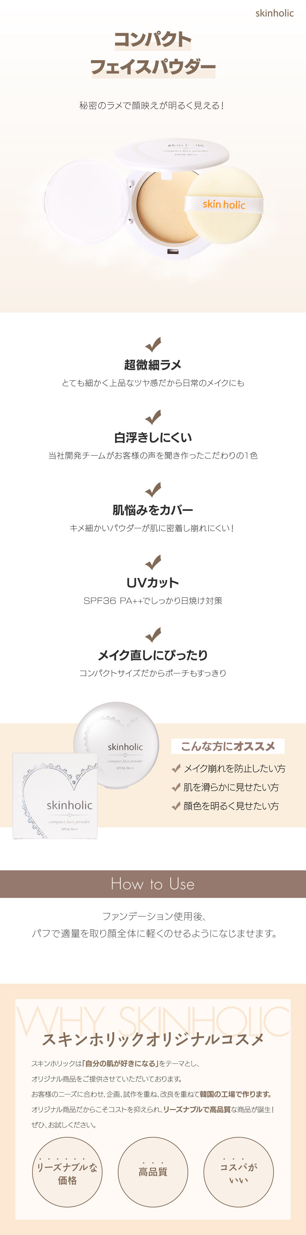新大久保の韓国コスメショップ「スキンホリック‐skin holic」の自社ブランド! コンパクトフェイスパウダー。 超微細ラメの上品なツヤ感で日常メイクにも! シミやくすみの悩みをカバー! ほんのりパール感で自然に輝く美人肌を表現。キメ細かいパウダーが肌に密着し崩れにくい!