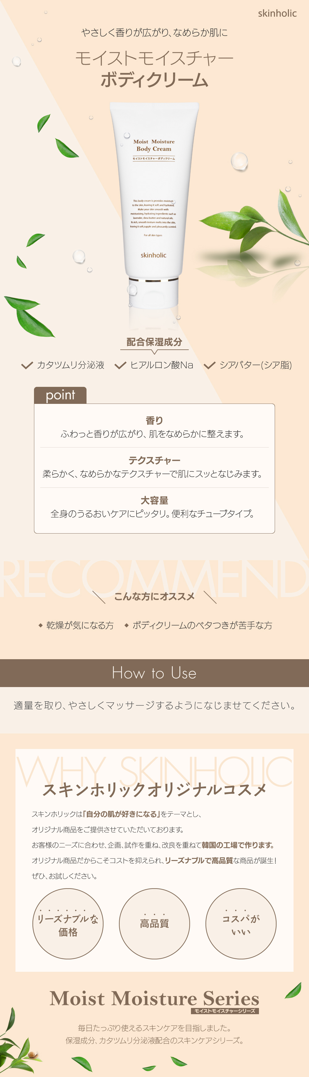 柔らかく、なめらかなテクスチャーで肌にスッとなじみます。大容量で全身のうるおいケアにピッタリ。便利なチューブタイプ。乾燥が気になる方、ボディクリームのベタつきが苦手な方にオススメ。#韓国コスメ #新大久保 #高コスパ<モイストモイスチャーシリーズ>スキンホリックオリジナルコスメ。毎日たっぷり使えるスキンケアを目指しました。保湿成分、カタツムリ分泌液配合のスキンケアシリーズ。